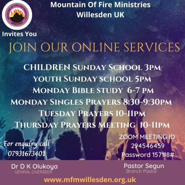 Dearly Beloved, You are invited to join our PRAYER Line with Pastor Segun MFM Willesden. Remember Jabez cried to the lord in prayer, and God granted his request As you join every week , the lord will hear you and grant your request. Invite someone & join us every Tuesday & Thursday Time : 10pm…
